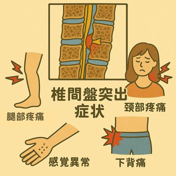 椎間盤突出的症狀因突出位置與壓迫程度而異,常見症狀包括: