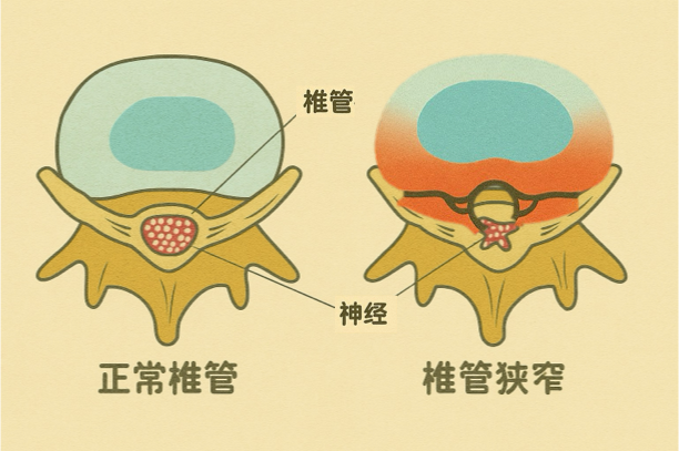 曾醫師臨床上最常跟病人及家屬解釋:脊椎裡面有一條「神經的通道」,就像水溝一樣,讓神經可以順順地傳遞訊號到手腳。但隨著年紀增長,脊椎會慢慢退化,像是骨頭長出骨刺、韌帶變厚,或椎間盤突出了,這些都會讓原本寬寬的水溝變得越來越窄。