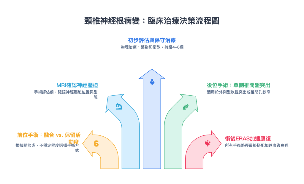 若非手術治療無效,或症狀持續惡化(如持續肌肉無力、神經功能喪失或嚴重疼痛),需進一步評估手術治療。手術選擇依據病理類型(如單側神經根病變或椎間孔神經根病變)及患者狀況,旨在解除神經壓迫並維持頸椎功能。